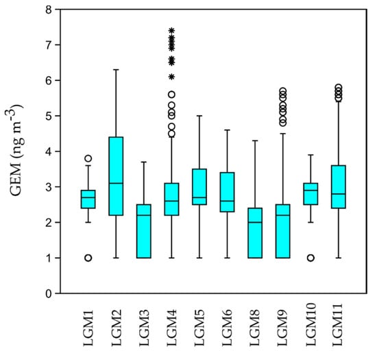 The results show that GEM levels are quite low (on average <3.00 ng m−3, except at LMG11-Torviscosa) if compared to the threshold values and safety regulation reported in Oyarzun et al. [66] (World Health Organization guideline fixed at 1000 ng m−3; The United States Environmental Protection Agency reference concentration for inhalation 300 ng m−3) and in Vaselli et al. [67] (values recommended by the issuing Tuscany Regional authorities, <300 ng m−3, referred to contaminated soils), thus resulting in a null risk of exposure through inhalation pathway for the local inhabitants. In general, the average GEM concentrations observed in this study are slightly higher than the natural background estimated for the northern hemisphere (1.5–1.7 ng m−3, [28]) and for the Mediterranean area (1.75–1.80 ng m−3, [68]), except for the values obtained in the western part of the lagoon (LGM8 = 1.80 ± 0.74 ng m−3; LGM3 = 1.86 ± 0.71 ng m−3) which are in line with the above cited background levels. Moreover, average GEM concentrations over the lagoon are in the same order of magnitude as those found for the coastal area of the nearby Gulf of Trieste [54] and for the marine boundary layer of the Northern Adriatic Sea [69]. A significant difference was found between sample medians by applying the Kruskal–Wallis test [70] (p = same = 2.81 × 10−136), a nonparametric method for testing whether there are statistically significant differences between two or more groups of an independent variable. The box and whisker plot representation (Figure 2) shows the marked dispersion of data at sites LGM4, LGM9 and together with the presence of several outliers which could be due to the micrometeorological variability of the sites during sampling [54]. The maximum value of GEM found in this study near Torviscosa (LGM11 = 3.04 ± 0.66 ng m−3 on average) is related to the presence of the decommissioned CAP, where some areas such as the ex-cell house and distiller displayed GEM levels up to 5000 ng m−3 [36]. Here, GEM is emitted from the contaminated materials of old buildings due to high temperatures and the intensity of solar radiation [36] and is dispersed by the prevalent northern winds (see Figure 3c).