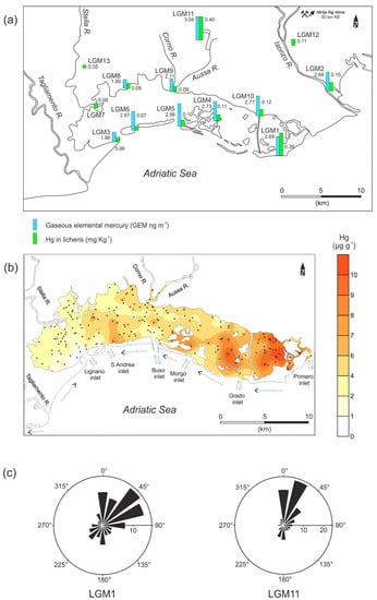 (a) GEM concentrations (light blue) and Hg contents in lichens (green). (b) Distribution of Hg concentrations in the sediments of the Marano and Grado Lagoon (modified from [48]); dotted arrows represent longshore currents and related sediment transport, simple arrows indicate tidal fluxes through the lagoon inlets. (c) Wind rose for LGM1 (Grado) and LGM11 (Torviscosa, CAP) calculated from 2013 wind data in selected sites. The radius length indicates the frequency of wind directions.
