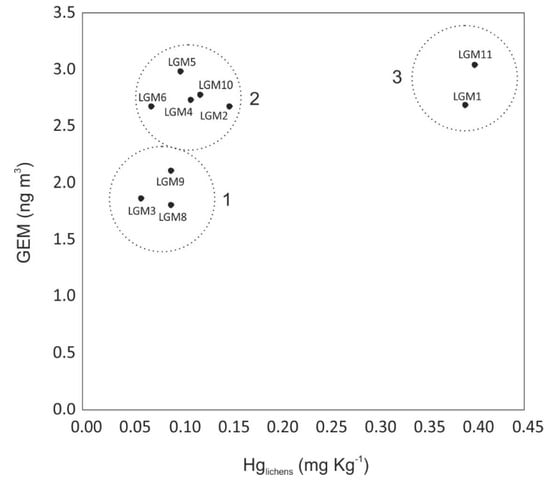 In the scatterplot reported in Figure 4, which compares GEM measurements and Hg concentrations in the lichens of Table 1, three groups of data can be identified. Groups 1 and 2 show differences in GEM concentrations, which can be ascribed to Hg distribution in the sediments of the lagoon as stated above, but they do not show substantial differences with regard to Hg content in lichens.