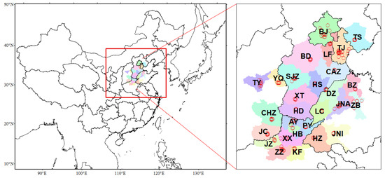 Simulation domain and observation sites in 2 + 26 cities of North China Plain (red dots: surface monitor sites for NO2, SO2, O3, and PM2.5; the 28 cities are BJ, Beijing; TJ, Tianjin; BD, Baoding; CAZ, Cangzhou; HD, Handan; HS, Hengshui; LF, Langfang; SJZ, Shijiazhuang; TS, Tangshan; XT, Xingtai; TY, Taiyuan; YQ, Yangquan; ZZ, Zhengzhou; JZ, Jiaozuo; AY, Anyang; HB, Hebi; XX, Xinxiang; KF, Kaifeng; PY, Puyang; HZ, Heze; LC, Liaocheng; DZ, Dezhou; JNI, Jining; ZB, Zibo; JNA, Jinan; BZ, Binzhou; JC, Jincheng; CHZ, Changzhi).