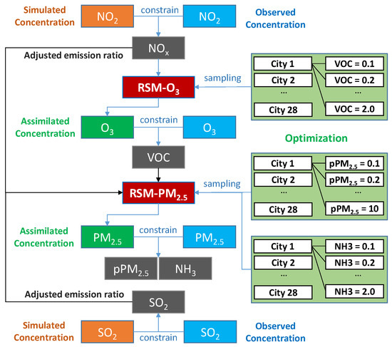 Figure 2 presents the framework for the newly developed RSM-assimilation method. As in our previous study [3], we first estimated the adjusted emission ratios of NOx and SO2 based on the comparison of simulated and observed NO2 and SO2 concentrations. Next, an optimization process was implemented that sampled VOC emission ratios as inputs for the RSM-O3 model. This process resulted in optimized VOC emission ratios for the 28 cities that yielded the best agreement between simulated and observed O3 concentrations at the monitoring sites (determined by the average RMSE over all the sites). A similar optimization process was then applied for PM2.5, where the adjusted NOx, SO2, and VOC emission ratios were introduced into the RSM-PM2.5 model, and emission ratios were sampled for NH3 and pPM2.5 in the 28 cities. Since direct observations of surface NH3 concentrations are unavailable, the optimized pPM2.5 and NH3 emission ratios correspond to the assimilated PM2.5 concentrations that agree most closely with observed PM2.5 concentrations among all possible combinations of emission ratios. The optimization was conducted through a multiple looping process to select the best combination of emission ratios (with a small step of 0.05) for different pollutants and cities to achieve the best overall agreement. As currently designed, the RSM was suitable for emission ratios of gas pollutants that ranged from 0 (fully controlled emissions) to 2 (doubled emissions). The response functions of O3 and PM2.5 to emission changes of gaseous precursors were fitted through the regression of multiple emission-control scenario simulations (emission ratios from 0 to 2); thus, the uncertainties of the response functions will be considerably larger when the emissions vary outside of the 0–2 emission ratio range. Here, we limited the adjusted emission ratios of NO2, SO2, VOC, and NH3 to a range from 0.1 (90% reduction) to 2.0 (100% increase). We allowed a wider range for pPM2.5 emission ratios due to the large uncertainties in pPM2.5 emissions, particularly for fugitive emission sources like wind-blown dust. Unlike the gas pollutants, the RSM had no limits on the adjusted emission ratios for pPM2.5, since the impacts of these emissions were represented linearly in the RSM [16].