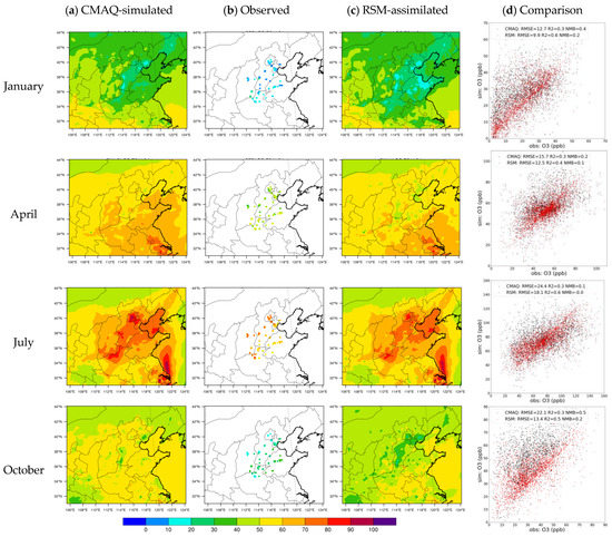Comparions of CMAQ-simulated, observed, and RSM-assimilated O3 concentrations: (a) CMAQ-simulation; (b) Observation; (c) RSM-assimilation; (d) Comparison between CMAQ-simulation or RSM-assimilation against with obervation (the comparison was done on a monthly basis for each month of comparison; unit, ppb).