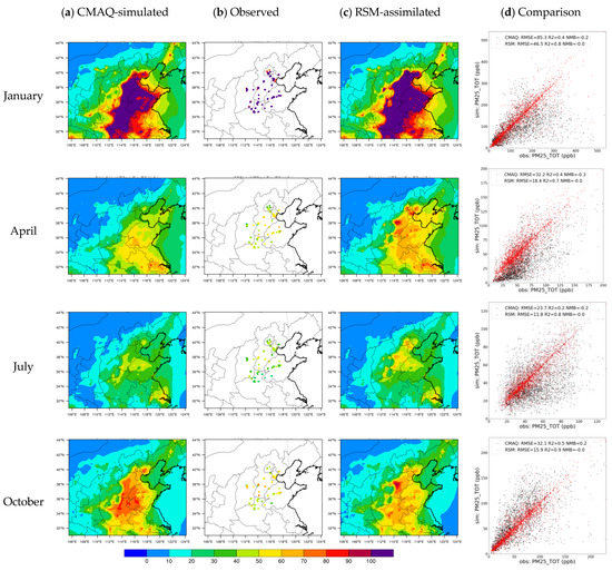 Comparisons of CMAQ-simulated, observed, and RSM-assimilated PM2.5 concentrations (a) CMAQ-simulation; (b) Observation; (c) RSM-assimilation; (d) Comparison between CMAQ-simulation or RSM-assimilation against with obervation (the comparison was done on a monthly basis for each month of comparison; unit, μg·m−3).