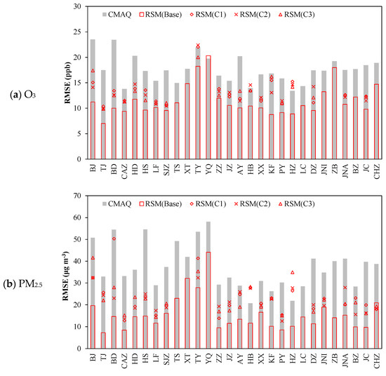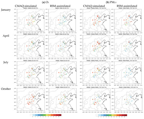 Although the RSM-assimilation improved the simulation accuracy, large discrepancies in the performance improvements were evident among the 28 cities. To further investigate the variation of RSM-assimilation performance across all observation sites, we compared the RMSEs of CMAQ-simulated and RSM-assimilated O3 and PM2.5 in the 28 cities at the four-month averaged level, as shown in Figure 5.