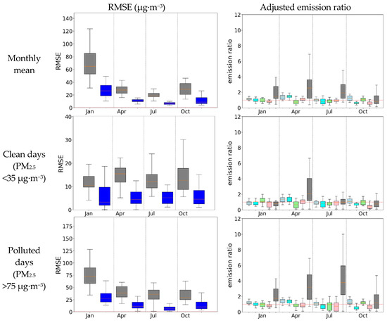 The RMSE (left: grey, CMAQ; blue, RSM) and Adjusted emission ratio for the air quality assimilation (right: baseline = 1. light blue, NOx; cyan, SO2, green, NH3; pink, VOC; grey, pPM2.5) at different polluted levels.