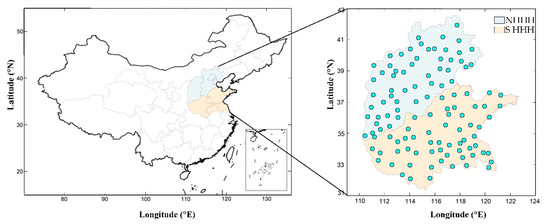 The location of the study area in China and the distribution of the meteorological stations. S3H and N3H indicate the southern Huang-Huai-Hai region and the northern Huang-Huai-Hai region, respectively.