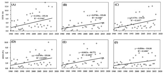 The trends of two high-temperature index variables ((A–C), high-temperature hours (HTH); (D–F), high-temperature degrees (HTD)) between heading and maturity in the Huang-Huai-Hai summer maize region during 1980–2016. (A,D), (B,E), and (C,F) indicate the southern Huang-Huai-Hai region (S3H), northern Huang-Huai-Hai region (N3H), and whole Huang-Huai-Hai region (3H), respectively.