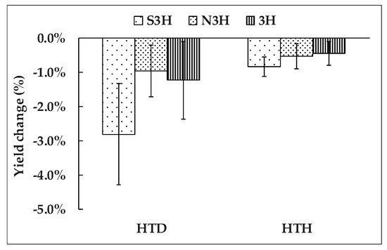Panel data analysis was performed to identify the impacts of HTH and HTD variations on yield (Figure 3). The results suggested that the increases in HTH and HTD had a negative effect on maize production. In the S3H region, an increase in HTH by 1 h corresponded to a decrease of 0.54–1.13% in yield, and a 1 °C increase in HTD corresponded to a 1.34–4.29% decline in yield, whereas in the N3H region, a 1 h increase in HTH corresponded to a decrease of 0.17–0.89% in yield, while a 1 °C increase in HTD corresponded to a 0.21–0.71% decline in yield. In summary, the high-temperature events have a greater impact on the summer maize yield in the S3H region than in the N3H region.