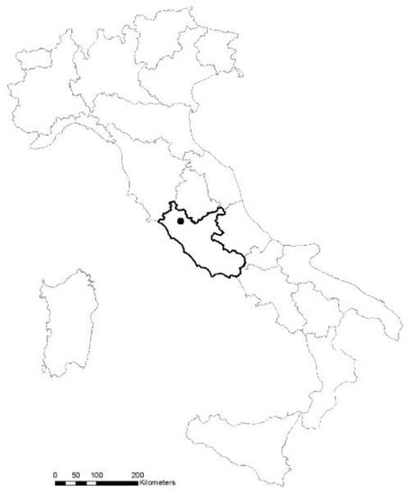The selected case study regards the rainfall time series of the Viterbo rain gauge, located in Lazio region, Central Italy (Figure 1). The rainfall data (provided by ‘Agenzia Regionale di Protezione Civile—Centro Funzionale Regionale’ of Lazio region) consist of Annual Maximum Rainfall (AMR) series of different sub-daily durations (1, 3, 6, 12, and 24 h) with a sample size N = 71 years. Moreover, a continuous high-resolution (5 min) rainfall series from 1994 to 2015 is available, from which the AMR series related to 5, 15 and 30 min were obtained, with N = 22 years.