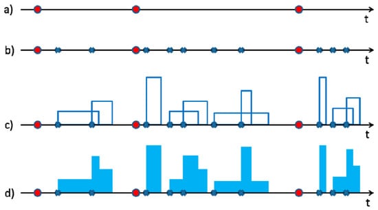 From De Luca and Galasso []. Representation of the Neyman–Scott Rectangular Pulses (NSRP) stochastic process for at-site rainfall modeling: (a) occurrences of storms (Equation (1)); (b) for each storm, determination of the number of pulses (Equation (2)) and their temporal occurrences (Equation (3)); (c) estimation of intensity and duration for all the pulses (Equations (4) and (5)); (d) calculus of total intensity at time, t, calculated as the sum of the intensities which are related to the active bursts at time, t.
