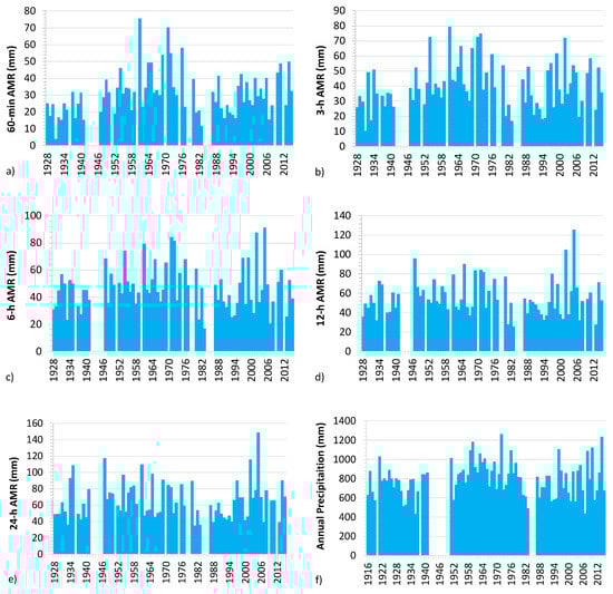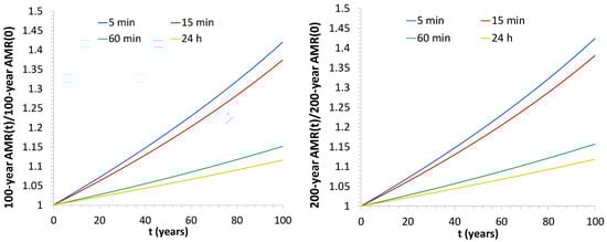 - For finer scales (5–15 min), from 10% (T = 100 years) and 18% (T = 200 years) at the beginning of the investigated period, to 60% and 80%, respectively, at the end;