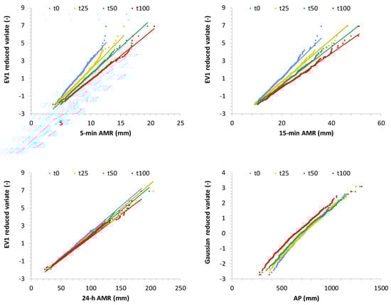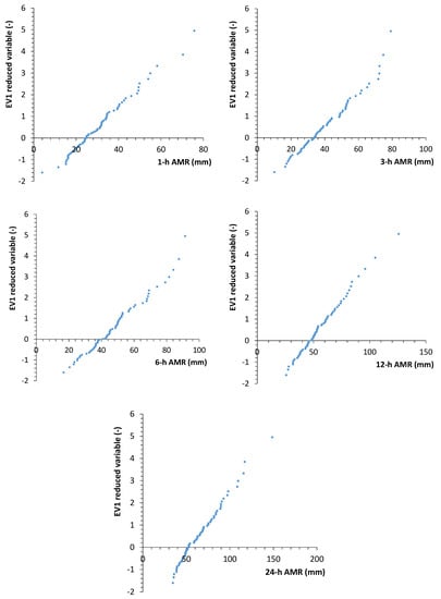 - For the i-th year (i = 1, …, 100), the EV1 parameters are estimated with the Maximum-Likelihood technique [], from the correspondent 500 AMR synthetic values;