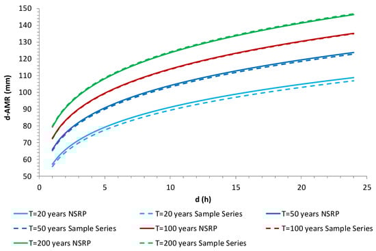 Authors chose here to calibrate the stationary model by considering the set that optimizes the reproduction of average values for hourly and multi-hourly AMR, plus the Mean Annual Precipitation (MAP). Then, the validation is carried out by comparing the following: (i) sample and theoretical Amount–Duration–Frequency (ADF) curves for hourly and multi-hourly rainfall heights; (ii) sample and theoretical average values of sub-hourly AMR series.