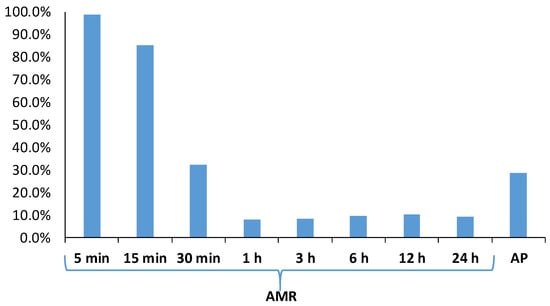 The histograms in Figure 7 indicate, for each investigated time resolution, the percentage of realizations with Zs > 1.96. The percentages decrease, passing from a 5-min to 1-h time resolution, and are always less than 10% for hourly and multi-hourly AMR synthetic data. Concerning AP, the percentage with Zs > 1.96 is about 30%.