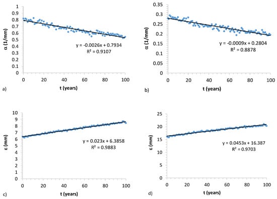 Concerning the variation of T-year percentiles and Hazard (Section 2.4.2), the possibility of applying regression formulas for estimated EV1 parameters along the 100-year period was investigated. Coefficients for linear regressions are shown in Table 6, together with the R2 values, which are greater than 0.5, so that the obtained regressions can be considered as acceptable []. As examples, the plots for 5- and 15-min EV1 parameters are illustrated in Figure 8.