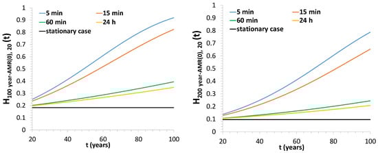 Temporal variation of 100-year (left) and 200-year (right) AMR quantiles with respect to the correspondent values of the stationary process.