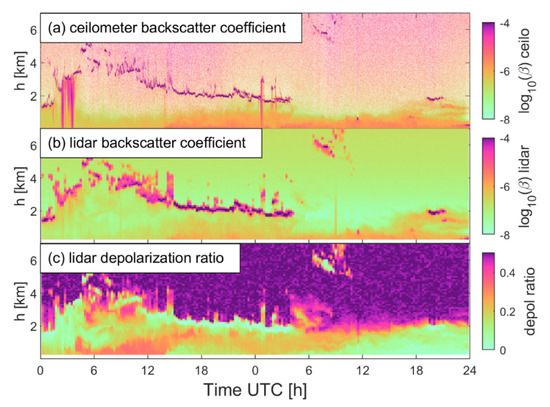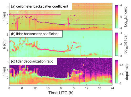 - Kotthaus, S.; O’Connor, E.; Münkel, C.; Charlton-Perez, C.; Haeffelin, M.; Gabey, A.M.; Grimmond, C.S.B. Recommendations for processing atmospheric attenuated backscatter profiles from Vaisala CL31 ceilometers. Atmospheric Meas. Tech. 2016, 9, 3769–3791. [Google Scholar] [CrossRef]