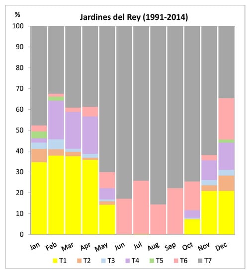 Bearing in mind the information obtained by observing the behaviour of sun and beach tourists [60], as well as the length of the day and the maximum possible hours of sunshine in the study area (which ranges from 10 h 46 min on 21 December to 13 h 31 min on 21 June), it was decided that the minimum amount of sunshine compatible with maximum enjoyment is 7 h (Type 1). This minimum limit can be reduced to 3 h of sunshine/day for the weather types with good weather and the occasional drawback (Types 3, 4, 5 and 6). The threshold was set at 3 < I ≤ 7 h for Type 2 (good weather with partial cloud cover). The threshold for Type 7 (bad weather unsuitable for sun and beach tourism) was set at less than 3 h/day.