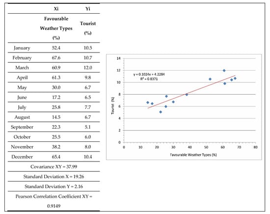 The distribution of favourable weather types at the Jardines del Rey region over the period 1991–2014 shows a high correlation with the monthly distribution of tourists during the same period (R = 0.92 and R2 = 0.84, a significant correlation given that the p value is less than 0.01) (Figure 2). This finding validates the classification proposed here. When establishing the weather types, the classification takes into consideration the climatic characteristics of the region, the behaviour of tourists based on an analysis of their visits to (Spanish) beaches and bioclimatic criteria.