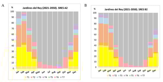 Figure 3. Annual distribution of weather types in Jardines del Rey (2021–2050, scenarios A2 and B2). (A) scenario A2 (B) scenario B2.