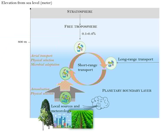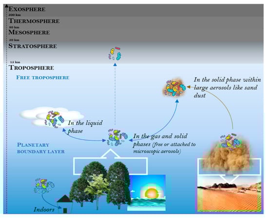 Aerobiology is a growing research area that covers the study of aerosols of a biological origin (i.e., bioaerosols) suspended in the atmosphere, from the air that directly surrounds us (both indoors and outdoors) to space by going through the different atmospheric layers (Figure 1). Bioaerosols include plant debris, pollen, microorganisms (bacteria, fungi, viruses, protozoans, etc.) as well as biological secretions [,] which are mainly emitted by natural (forests, oceans, deserts, etc.) and urbanized Earth surfaces (agricultural fields, waste water treatment plants, cities, etc.) at different emission rates [,]. Airborne microorganisms, especially bacteria, archaea, and fungi, are of particular interest as they represent living and potentially metabolically active cells light enough to be lifted high in the atmosphere by upward airflow [,,]. During extreme meteorological events such as volcano eruptions and dust storms, sand-dust associated microorganisms can be ejected tens of kilometers high in the atmosphere before landing back on the Earth’s surface thousands of kilometers away [,]. Microorganisms from the Bacillus and Micrococcus genera are commonly recovered from the stratosphere [,,]. Research on the “high life” [] intends to evaluate the global dispersion of microorganisms around our planet as well as establish the upper limit of the biosphere boundary and infer the probability of life in the universe [,]. Other interests are driving investigations of microorganisms in the lowest atmospheric layer, the troposphere, that surrounds the Earth’s surface. The role of airborne microorganisms in meteorological processes such as cloud formation and precipitation [,,,], atmospheric chemistry [,,,,], and air quality [,,,] are currently motivating multidisciplinary investigations on microbial communities in the troposphere. The capacity of microorganisms to be transported through the air has raised concern about the role airborne microorganisms might play in public health with the potential dissemination of plant and human pathogens as well as allergens [,]. The importance of airborne micro-organisms should motivate the inclusion of a biological component into the existing and future observing infrastructure of the earth atmosphere.