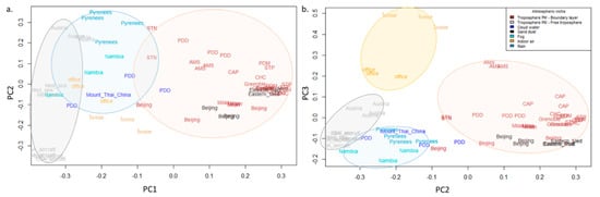Distribution of the samples coming from different phases of the atmosphere (cloud water, rain, fog, planetary boundary layer, and free troposphere particulate matter) based on the bacterial community structure. Public 16S rRNA gene sequencing based datasets were downloaded on public databases (Table S1 in Supplementary Data). Reads were filtered based on quality using FASTX-Toolkit then PANDAseq [] was used to assemble the read 1 and read 2 using the RDP algorithm (Ramer–Douglas–Peucker algorithm). The resulting sequences were annotated at the genus level by RDP Classifier [] using the RDP 16srrna database and an assignment confidence cutoff of 0.6. The PCo (Principal coordinates) analysis (components 1 and 2 in (a), components 2 and 3 in (b)) of the Bray–Curtis dissimilarity matrix is based on the relative abundances of the different bacterial genera.