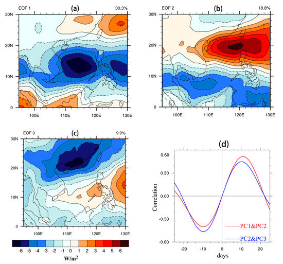 A number of studies have demonstrated that the BSISO over the SCS has two significant periods of intraseasonal oscillation, one of approximately 10–25 days and another of around 30–60 days. To extract BSISO signals, a bandpass filter was applied to daily anomalies (removing climatology from the daily mean) of variables, including OLR, wind, and precipitation [11,19]. We chose the Lanczos bandpass filter to process 21 years of OLR data by virtue of its advantages for computing long timescales [25,26]. Figure 1a–c shows 30–60-day bandpass-filtered OLR anomalies based on empirical orthogonal function (EOF) analysis, representing the location of deep convection in BSISO phases. These three EOF modes explain approximately two-thirds of the total variance (EOF1, 30.3%; EOF2, 18.8%; EOF3, 9.9%). This shows that BSISO-related convection originates from the equatorial western Pacific, strengthens at around 15° N, and dissipates over subtropical mainland China. Cross-correlation between the first and second principal components (PC1 and PC2, i.e., the solid red line in Figure 1d) is minimized (maximized) when PC2 lags (leads) PC1 by approximately 10 days. Principal components PC2 and PC3 (the solid blue line in Figure 1d) suggest that the lifecycle of the BSISO is around 40–60 days.