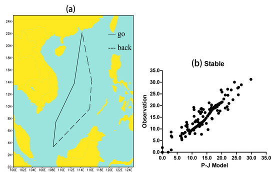 Accuracy test for the 2.3. Paulus-Jeske (P-J) model over the South China Sea (SCS) region during summer: (a) the voyage route of the Chinese Navy ships in summer 2016; (b,c) comparison of P-J models and observed duct height in (b) stable and (c) unstable atmospheric conditions.