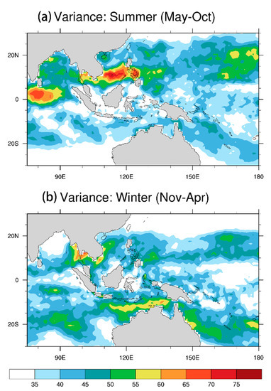 Variance of the boreal summer intraseasonal oscillation (BSISO)-related lower tropospheric evaporation in (a) summer (May–October) and (b) winter (November–April) based on OAFlux data (1996–2016).