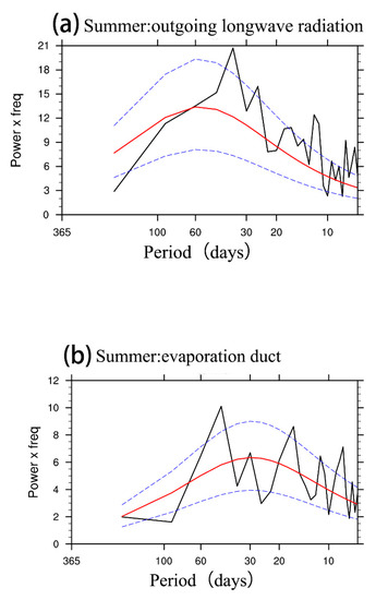 Lower tropospheric evaporation in the SCS shows the most prominent variability on intraseasonal timescales. However, sea surface evaporation does not equate to the evaporation duct, thus we require further verification of BSISO-related characteristics. The two dominant modes of the BSISO over the WNP with different frequency bands are those corresponding to 30–60 days and 10–25 days, of which the former is more significant [12,20]. The power spectra of OLR anomalies over the SCS (Figure 4a) are concentrated in two intraseasonal periods similarly to BSISO cycle time, as are the power spectra of the evaporation duct (Figure 4b). These confirm that the evaporation duct over the SCS has an intraseasonal variation in summer with the life cycle of 30–60 days. Thus, it is possible to further prove that BSISO activities may have influence the evaporation duct in the SCS area.