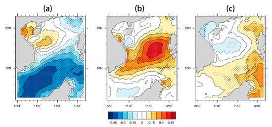 Correlation coefficients of BSISO-related anomalies of evaporation duct height over the SCS in summer. (a–c) correspond to the first/second/third EOF modes in Section 2. Dotted areas are statistically significant at the 99% confidence level based on a significant t-test.