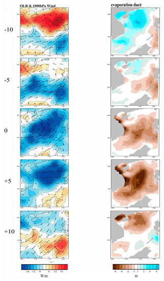 Figure 6 shows the composite 30–60-day bandpass-filtered anomalies of OLR, wind, and the evaporation duct during active convection phases of the BSISO over the SCS, which are identified via the principal components of EOF analysis in Section 2. We divided the northward propagation from the equator to subtropical East Asia into five phases accompanied by obviously cyclonic low-level wind anomalies (concentrated on days −10, −5, 0, +5, and +10). The right panels of Figure 6 show the associated evaporation duct anomalies, exhibiting a significant northward pattern related to convection in each BSISO phase. As negative OLR anomalies (deep convection) propagate northward from phase 1 to 5, negative duct height anomalies also gradually propagate to the subtropical coast in the same manner. Compared to OLR anomalies, the center of the evaporation duct lies to the southeast of the well-developed convection. Consequently, negative duct height anomalies appear after enhanced convection, probably indicating that variations in evaporation duct require a response time to BSISO activities. The suppressed phase follows similar rules with opposite features to the evaporation duct. In conclusion, the enhanced/suppressed evaporation duct followed a synchronized change rule with negative/positive BSISO convection (positive/negative OLR anomalies) during summer in the SCS.