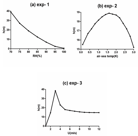Figure 7a shows that evaporation height has a significant negative correlation with atmospheric humidity. This is because the mechanism of the evaporation duct involves a sharp decrease in humidity over a small vertical spatial range at the air–sea boundary, and because lower air humidity corresponds to a higher vertical rate of decline of water vapor. Figure 7 also demonstrates that the influence of atmospheric humidity on duct height is more influential than other meteorological factors. Temperatures at the reference height changed from 25 to 28 °C, i.e., the air–sea temperature difference changes from 0 to 3 °C; the resulting variation in evaporation duct height is shown in Figure 7b. This indicates that, when the temperature difference is less than 1.6 °C, the duct is enhanced with increasing temperature difference; however, when the temperature difference is greater than 1.6 °C, the evaporation duct will continually decline with increasing temperature difference. In the last experiment, horizontal wind speed at the reference height changed from 1 to 12 m/s, and the corresponding variation in the evaporation duct is shown in Figure 7c. When the wind speed is less than 3 m/s, the results become distorted under this assumed condition. At wind speeds greater than 3 m/s, the duct height decreases with increasing horizontal wind speed, and the rate of decrease gradually levels off, even as wind speed continue to rise.