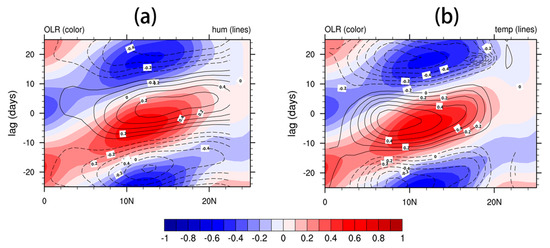 Latitude-based lead-/lag-time diagram of the composite raw pentad anomalies along the section of 110° E to 130° E for (a) outgoing longwave radiation (OLR, shaded) and air humidity (contour) and (b) OLR (shaded) and air-sea temperature (contour). The lead-/lag-time in days with positive (negative) values indicates the number of days after (before) day 0, equivalent to that shown in Figure 6.