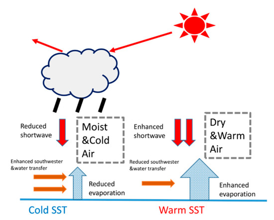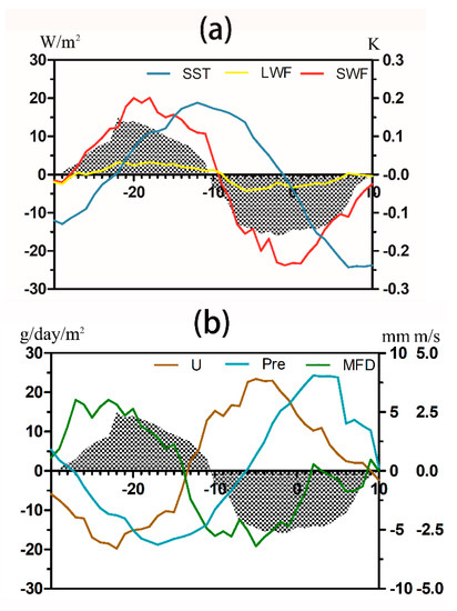 During summer, the air temperature over the SCS is predominantly influenced by solar radiation, whereas variation in air humidity results from precipitation, water vapor transport by monsoon, evaporation, and other factors. Based on the PC1 coefficients of EOF models, BSISO-related anomalies of downward short-wave radiation flux (SWF), upward long-wave radiation flux (LWF), and SST are shown in Figure 9a. Radiation flux anomalies are highly correlated with OLR anomalies (gray shaded), indicating that the former are modulated by convection. In the case of short-wave radiation, due to increased cumulus and cloud top in the phase of enhanced convection, incident solar radiation is reflected and absorbed, and less short-wave radiation reaches the boundary layer. In contrast, the magnitude of long-wave radiation is much smaller than that of short-wave radiation. SST and OLR are almost in quadrature, such that enhanced (suppressed) convection leads the cold (warm) SST change by approximately a quarter of a cycle, reflecting the delay in temperature variation of the underlying surface. Since the specific heat capacity of seawater is very large, the range of variation in SST is much smaller than that of air temperature. During the summer, the ocean provides a “cold source”, such that the air–sea temperature difference is positive when the air temperature rises in fair weather.