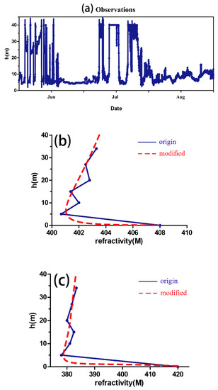 The BSISO is closely related to the strength of the SCS monsoon; usually, the BSISO is more visible in active monsoon years. The year 2018 was a relatively strong year in terms of the recent SCS monsoon, thus we selected hydrometeorological data from June to September 2018 for analysis. Data acquisition was conducted once per minute, but strong turbulent motion near the sea surface causes significant data fluctuation. Therefore, when cases with significant error are removed and data are averaged for each hour, better constraints of daily variations in the evaporation duct are obtained. Figure 11a shows that the evaporation duct exhibits periodic variation characteristics, consistent with the intraseasonal oscillation of the BSISO. During the negative phase of the BSISO, the averaged height of the evaporation duct is higher and exhibits significant changes, whereas in the positive phase, the height is relatively low and the variation trend more stable. We chose data typical of the BSISO positive (5–10 June) and negative (5–10 July) phases over the SCS in order to calculate modified refractivity profiles (Figure 11b,c). Figure 11b shows that the height of the evaporation duct is 6.77 m and its strength is 8.22 M, while the values shown in Figure 11c are 31.01 m and 43.56 M, respectively.