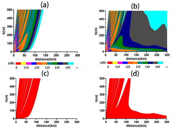 Figure 12a,b shows the loss of electromagnetic propagation under evaporation duct conditions, where smaller values of loss denote stronger field strengths. For ease of display, we used a plane instead of Earth curves, such that the path of electromagnetic waves is bent upward. It can be clearly seen from the figure that, in the case of strong evaporation ducts, the energy of the electromagnetic wave can travel further; this is usually referred as “over-the-horizon propagation (OTHP)”. Furthermore, the energy near the surface is stronger as a result of high ground or sea surface reflectivity. Although there is also a weak evaporation duct in the active convection of the BSISO, the antenna height (20 m) is greater than the duct height (6.77 m), such that the electromagnetic field does not change significantly. A stronger evaporation duct extends the range of radar detection but also forms a blind area on top of the duct (Figure 12c,d). A trapping layer can be formed from sea level to the top of the evaporation duct, causing the original electromagnetic blind area to disappear; however, the duct can change the trajectory of electromagnetic radiation, resulting in the development of a blind area (90 to 110 km) at the maximum calculated height (500 m), which is far from the starting position of the blind zone under standard atmospheric conditions.