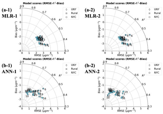 Statistical scores of the testing results of the (a-1,a-2) MLR and (b-1,b-2) ANN models with (1) set 1 and (2) set 2 predictors. Site labels are referred from Table 2. Diamonds, crosses and circles are UNY, rural and NYC sites, respectively.