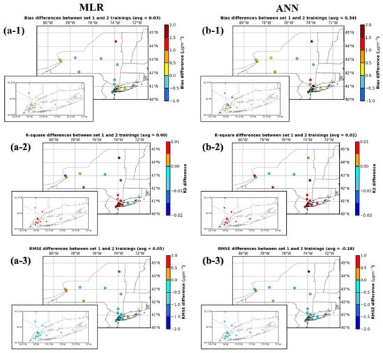 Differences of bias (1), R-squared (2) and RMSE (3) values at selected sites between the (a-1,a-2,a-3) MLR-1 and MLR-2 models, and the (b-1,b-2,b-3) ANN-1 and ANN-2 models. Differences were defined as the statistical scores of set 2 model minus those of set 1 model.