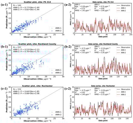 Additionally, to better understand the influence of vertical predictors on PM2.5 prediction at each category of sites, the testing results at three sites with the lowest RMSEs were analyzed. The PS 314, Rockland County, and Rochester sites were selected as the representatives of NYC, rural and UNY sites, respectively. Additionally, since vertical predictors showed limited contributions in the MLR models in previous discussions, only the results from the ANN models were discussed. Figure 4 illustrates the scatter plots between observed and predicted PM2.5 concentrations from the ANN models and the corresponding data plots at selected sites. For PS 314 site (Figure 4a), data plots showed that the ANN-2 model had better performance in predicting spikes with smaller differences between observations and predictions, compared to the ANN-1 model. Although the differences were small, the positive effects of vertical predictors on PM2.5 concentrations at NYC sites were not neglectable. Similarly, the testing results of the ANN models at Rockland County site (Figure 4b) showed that the ANN-2 model had better capability of predicting spikes. Although the ANN-2 model still showed outliers in the scatter plot, it provided more accurate estimations with higher R2 and lower RMSE. On the other hand, the testing results from two ANN models at Rochester site (Figure 4c) were comparable, showing a limited influence of vertical mixing.