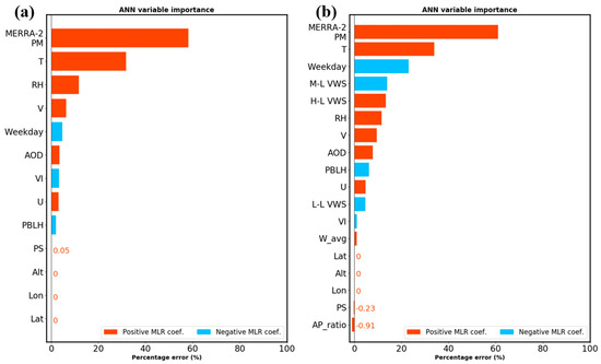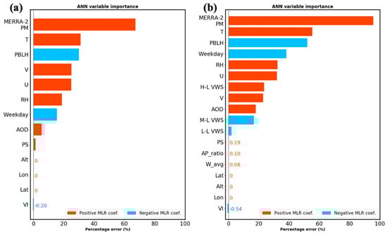 Variable importance of (a) set 1 and (b) set 2 models at Rochester site. Values indicate the permutation importance estimated from the ANN models, and colors indicate the signs of regression coefficients in the MLR models.