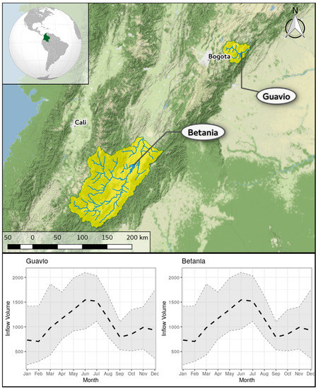 Colombia has established its power market in 1995, driven primarily by the goal of increasing the reliability of energy supply in the domestic power system [70]. Due to lower-than-expected results in providing a reliable supply of energy along competitive outcomes, the original regulated energy market based on capacity payment was replaced in 2004 by a reliability market intended to ensure supply during tight hydrological conditions, often connected to El Niño phenomena [71]. In this context, private companies managed to enter the and establish themselves in the hydropower energy market in Colombia, and the selected case study areas are two large hydropower plants located in Colombia, namely Betania and Guavio, with a total combined capacity of 1790 MW, both managed by ENEL Greenpower Emgesa SA ESP society (see Figure 1). The Betania hydropower plant’s capacity is about 540.0 MW and has an average production of 2000 Gwh/year, being located in the Rio Magdalena catchment and counting with an upstream drainage area of about 13,000 km2. The Guavio hydropower plant, although having a smaller upstream drainage area of about 1500 km2, can produce approximately 2.3 times more energy than the Betania hydropower plant, having a capacity of roughly 1250 MW and an average annual production of 5500 Gwh/year. The climatological average of the monthly inflow river discharge to both reservoirs (calculated over the period spamming all the available data, i.e., from 1993 to 2019) are shown in Figure 1.