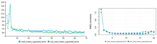 Example of two training attempts of machine learning models from Group 3 that use the validation dataset as support information for early stopping. The x-axis represents training epochs. On the left, a training attempt of the long short-term memory (LSTM) model (y-axis indicates absolute root mean squared error (RMSE) values), and on the right, a training attempt of the non-linear autoregressive neural networks (NARX) model (y-axis indicates normalised RMSE values), both for one month lead-time forecasting at the Guavio reservoir.