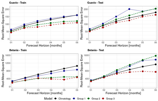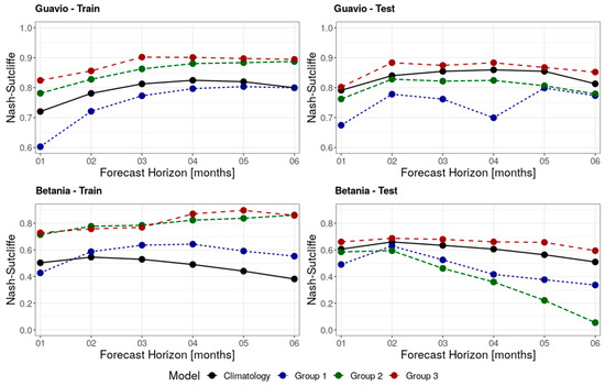 Given the results shown in Figure 4 and Figure 5, and Table 3, it is possible to verify that, as the forecast horizon increases, the forecasted results are subject to larger errors, both in the training and also in the test datasets, as shown by the generally increasing RMSE values. Interestingly, the NSE results indicate a less pronounced worsening of the results, while in some cases such as with the NARX or the Persistence models, the NSE results might increase as the forecast horizon increases. This contrasting behaviour is explained by two main factors: (i) the forecasted values are accumulated values spanning the forecast horizon and (ii) the NSE model efficiency coefficient is limited from minus infinity to +1, while the RMSE is not bounded. The first point explains why the RMSE increases as the forecast horizon increase, even if the NSE results do not follow the same pattern, as the scale of the forecasted values are different (e.g., average of approximately 1000 Mm3 for 1 month forecast and 6000 Mm3 for 6 months forecast for the Betania hydropower plant), while the second point explains the difference in behaviour between the two metrics, as the NSE values are in some sense normalised for the different scales of the target values.