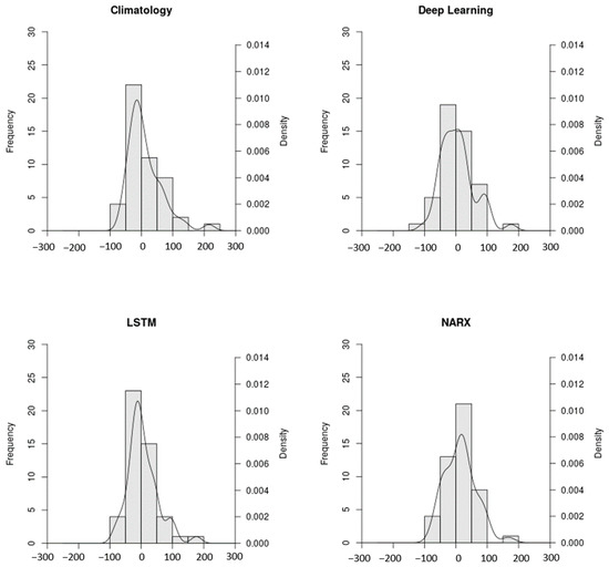 In order to better understand the behaviour of the models in Group 3 with respect to climatology, the error histogram and the scatter plot distribution of observed versus forecasted values are analysed. These results are shown in Figure 6 and Figure 7. Figure 6 displays the error histogram of Group 3 models and climatology for a forecast horizon of 1 month for the Guavio reservoir, while Figure 7 displays the scatter plot of observed values versus forecasted values for the same models, time horizon, and case study.