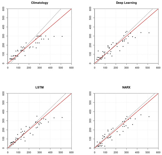 Scatter plot (observed values on the x-axis and forecasted values on the y-axis) of Group 3 models and climatology for a forecast horizon of 1 month for the Guavio reservoir. The red line indicates a perfect fit of observed and forecasted values, while the black dashed line corresponds to the linear regression of the observed values given the forecasted values.