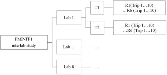 Schematic hierarchy of Labs (Lab 1–Lab 8), Tests (T1 and T2), Repeats (R1–R6) and Trips (Trip #1–Trip #10).