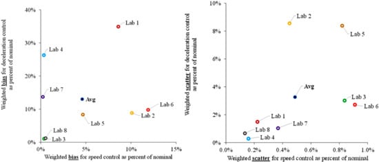 Accuracy/bias for each lab and speed range relative to the nominal set-points from the WLTP–brake cycle displayed as a scatter plot in Figure 2 (left-hand side). The bias in speed is smaller than 1 km/h compared to the individual set-points; the weighted bias compared to the nominal WLTP–brake cycle is 2.1 km/h (4.6%) on average for all labs combined. Labs 3, 4, 7, and 8 exhibited a weighted average bias below 0.2 km/h (1%). Lab 5 exhibited a bias comparable to the overall averages except for an average bias of 20 km/h during the motorway section. Labs 1 and 2 exhibited a weighted average between 4–5 km/h, with rural and motorway events being more penalised. Lab 6 exhibited a systematic bias or about 4.5 km/h (>10%) for all types of brake events. Regarding deceleration, labs exhibited a weighted average bias of 0.13 m/s2, which corresponds to 13% of the nominal value. It is noteworthy that Labs 1, 4, and 7 controlled the brake with a bias higher than 15%. These labs indicated issues with the design of the control programme and the use of an incorrect set of parameters for the parasitic vehicle losses. Labs 3 and 8 exhibited the smallest bias in all three different speed ranges.