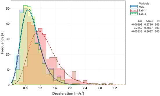 Histograms for all decelerations during T1‒R1 for Lab 1 and Lab 3 and the nominal WLTP–brake cycle—the continuous lines represent the lognormal distribution for each dataset.