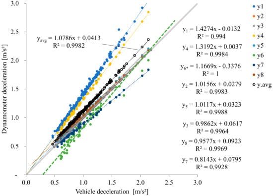 Deceleration by event for each lab (T1-R1), the vehicle, and the overall average. The solid grey line identifies the ideal regression line (vehicle). The dataset with a regression line yavg = 1.0786x + 0.0413 indicates the general average excluding Lab 6.